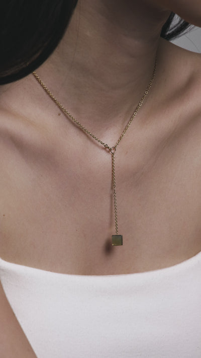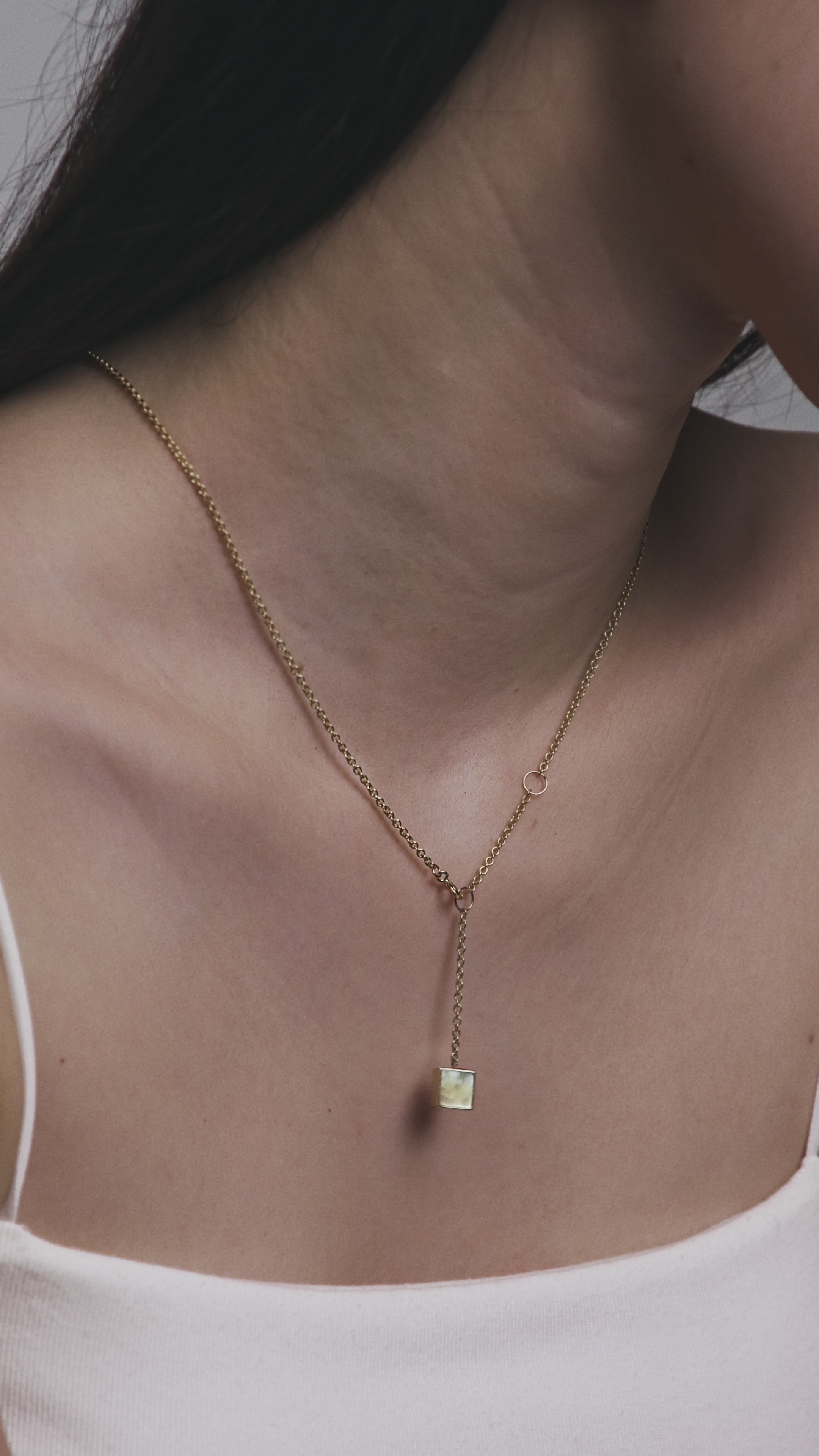 A necklace made of 10K gold and yellow mother-of-pearl, available in two lengths.